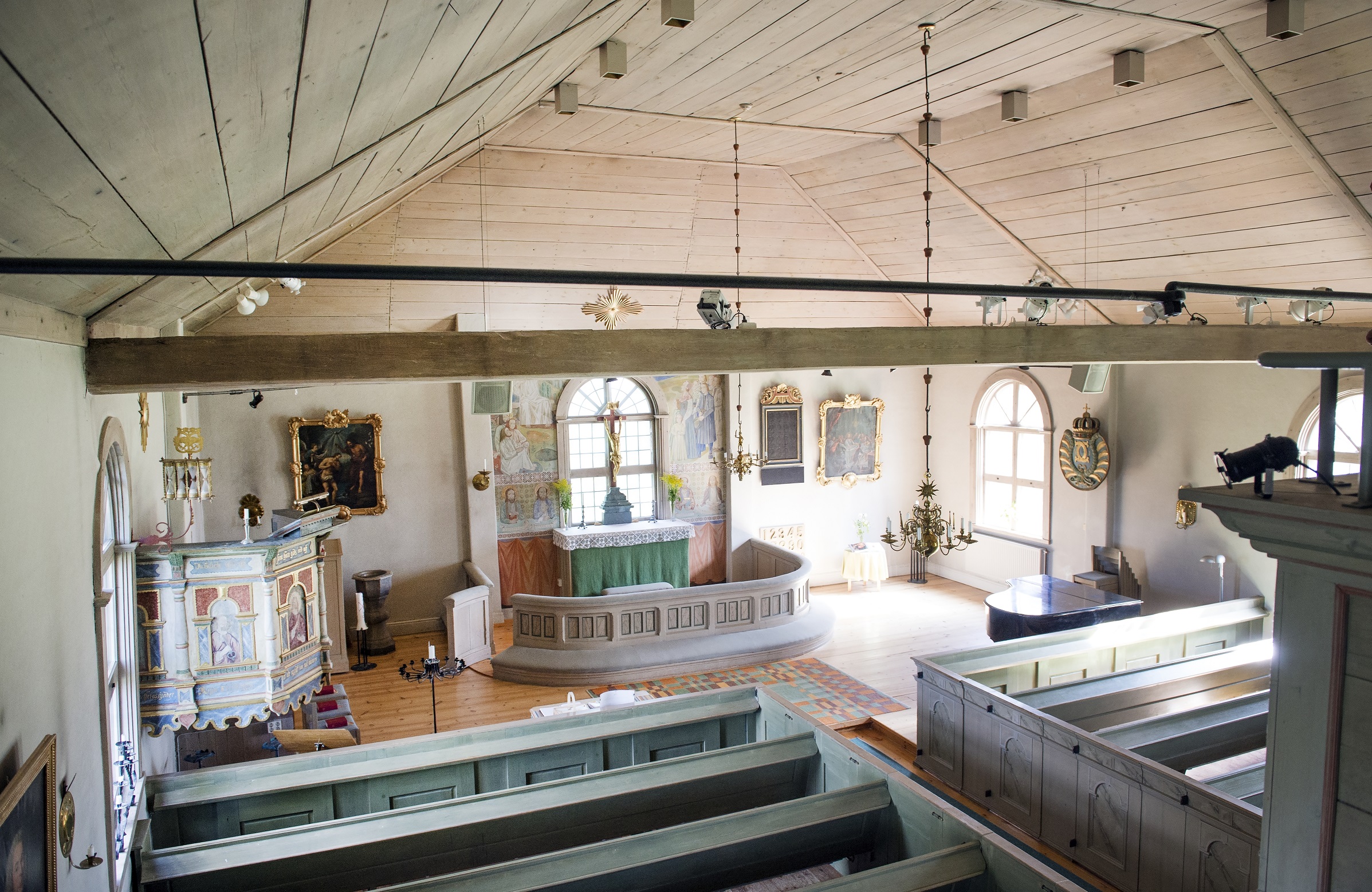 I kyrkan hänger flera målningar och porträtt. Ovanför dörren till sakristian avbildas Kristus, smärtomannen. På södra väggen mittemot finns ett namnchiffer tillhörande Karl den XI som var kung i Sverige då kyrkan byggdes.