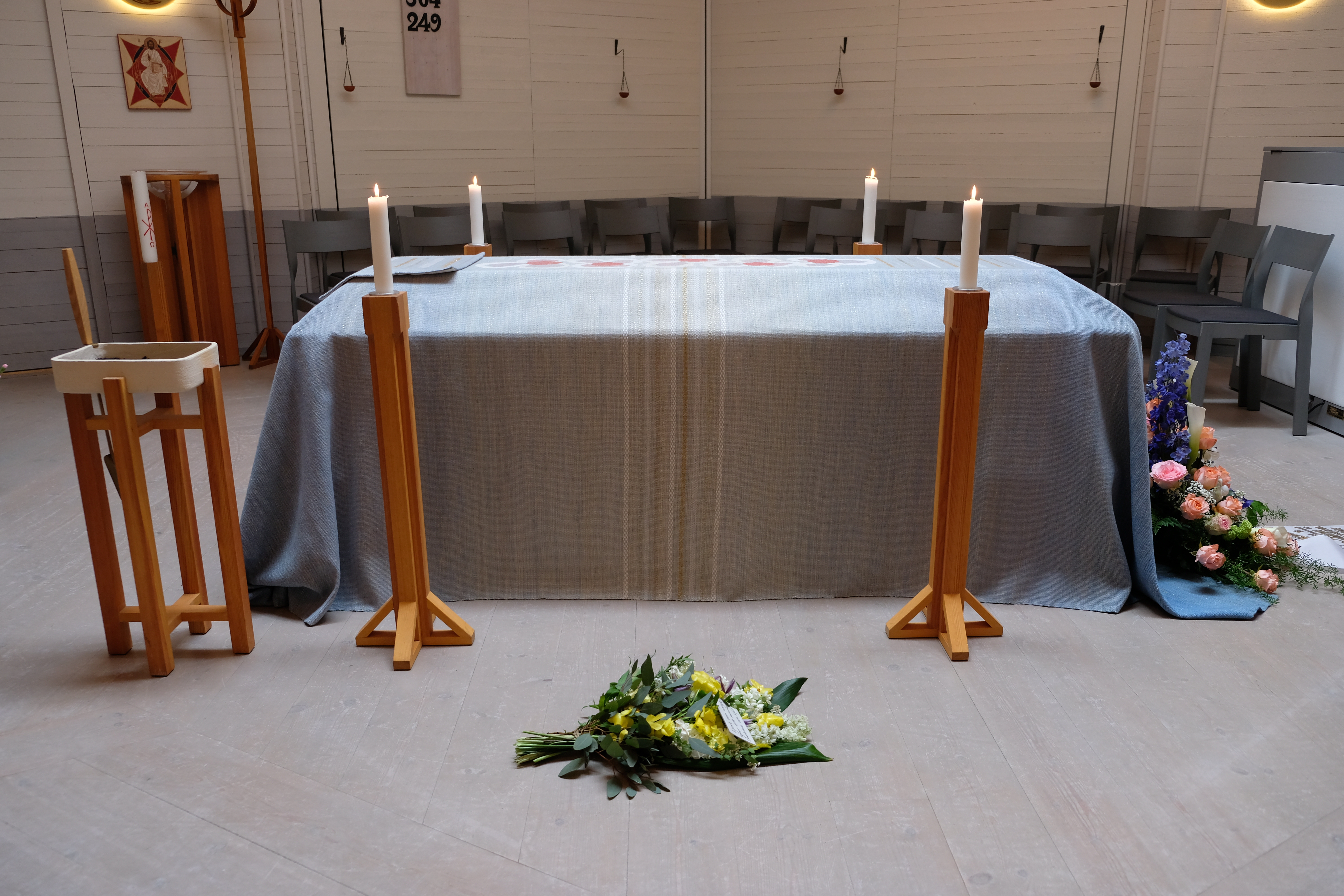 Bårtäcket är en vacker utsmyckning av en kista. Det är ett specialvävt tyg som omsluter kistan med gyllene trådar som skimrar i kyrksalen. Du kan låna det utan kostnad.