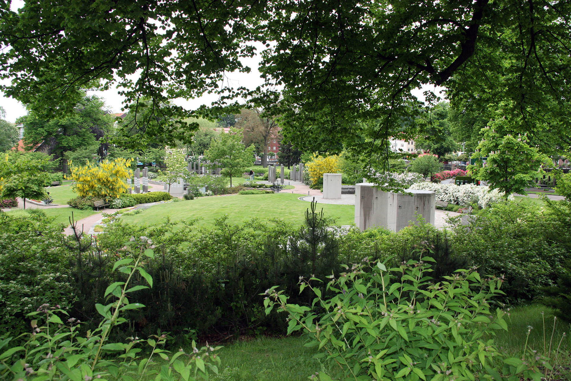 Det finns också buskage, planteringar, träd och gångvägar kantade med smyckningsmurar. På murarna finns planteringar och vattenkar där besökare kan placera snittblommor. Vintertid täcks rännor och rabatter med granris. Det finns även ljusbärare för gravljus.