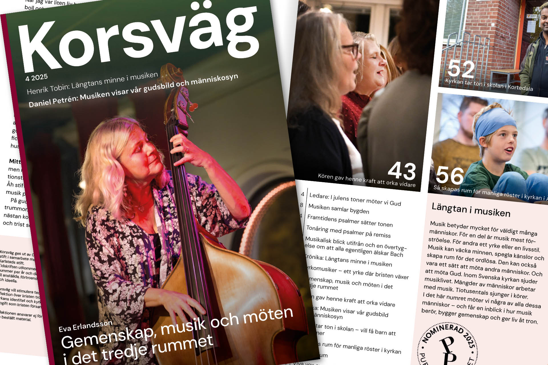 Inom Svenska kyrkan sjuder musiklivet. Mängder av människor arbetar med musik. Tiotusentals sjunger i körer. Musik betyder mycket för väldigt många människor. Musik kan också vara ett sätt att möta andra människor. Och att möta Gud. I det här numret möter vi några av alla dessa människor – och får en inblick i hur musik berör, bygger gemenskap och ger liv åt tron.
