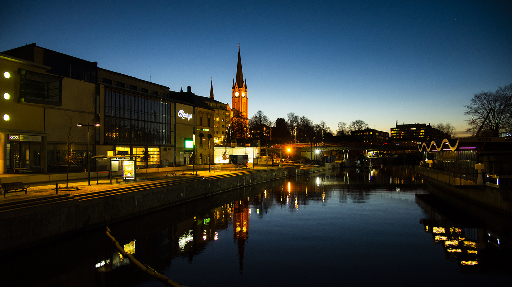 Sundsvalls Gustav Adolfs kyrka bildar blickfång dag som natt, i stadsvimlet, från stadsbergen och för förbipasserande längs de båda Europavägarna som går förbi Sundsvall.