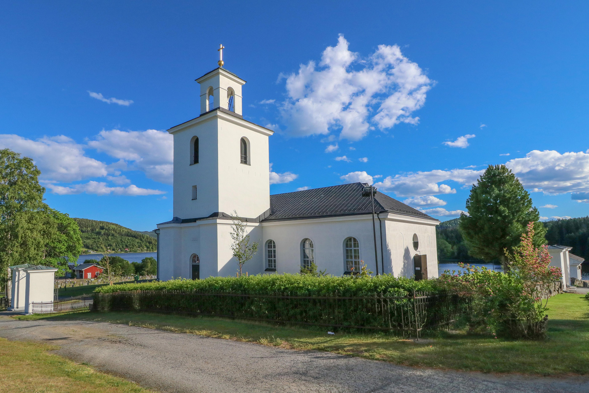 Utanför kyrkan står 12 kyrkstallar som är de som finns kvar av ca 80 som en gång stod runt kyrkan.