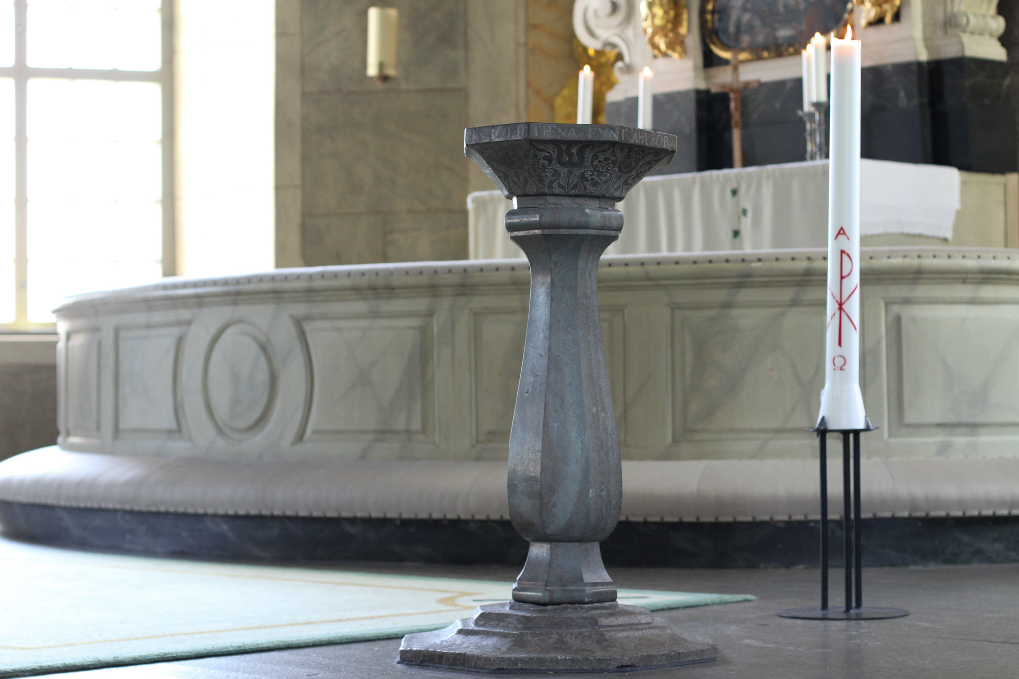 Han bär på två förgyllda ljus,