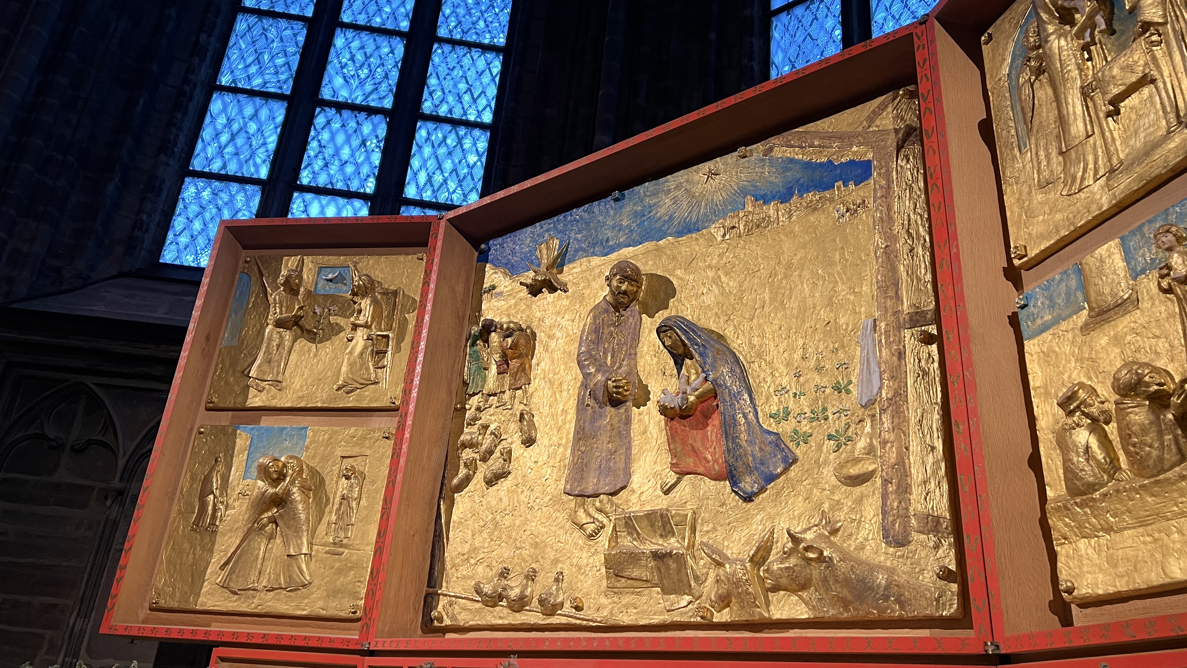 På predellan finns tio rosor gjutna i brons. Rosorna syftar på Marias rosenkrans och bönen Hell dig, Maria.