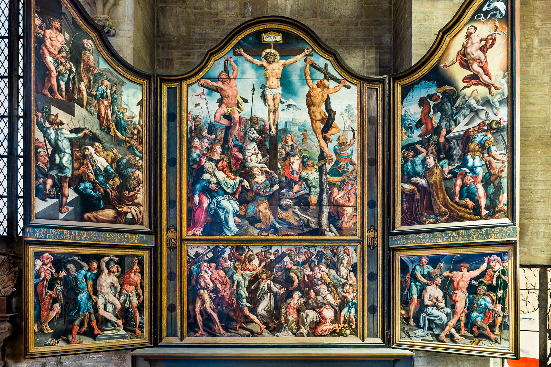 Maarten van Heemskerck är en av de viktigaste renässanskonstnärer från Nederländerna. (Född i Heemskerck nära Alkmaar.) Han målade många altarskåp till kyrkor runtom i Europa, men inget av dem är lika stort som detta. Måleristilen kallas för manierism, en populär stil under 1500-talet med en närmast överdriven detaljrikedom i klara färger med dramatiska rörelser.