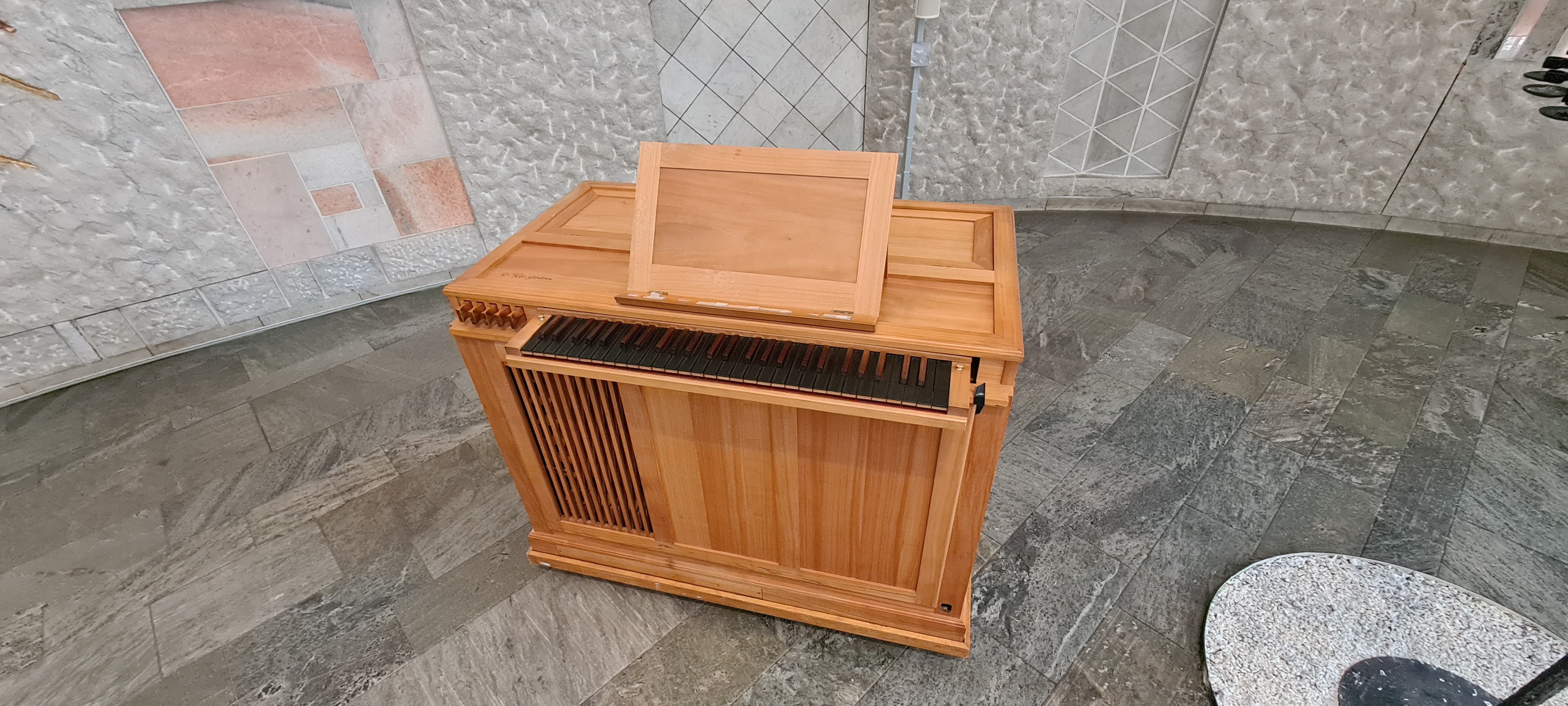 Orgeln transponerbar en halvton ned genom flyttbar klaviatur.