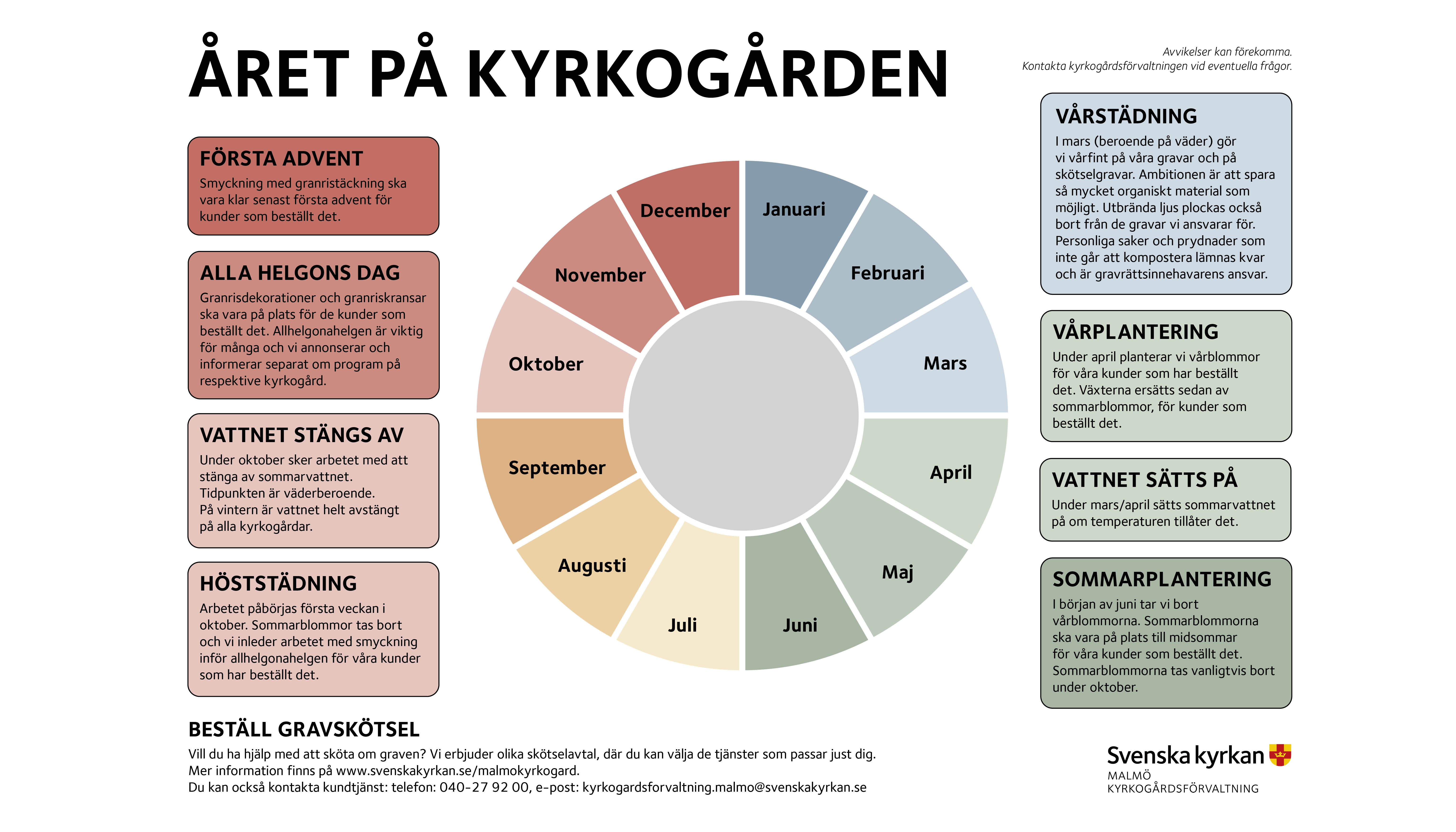 När planteras vårblommorna? När stängs vattnet av på hösten? I vårt årshjul ser du vad som händer på kyrkogårdarna vid olika tidpunkter.