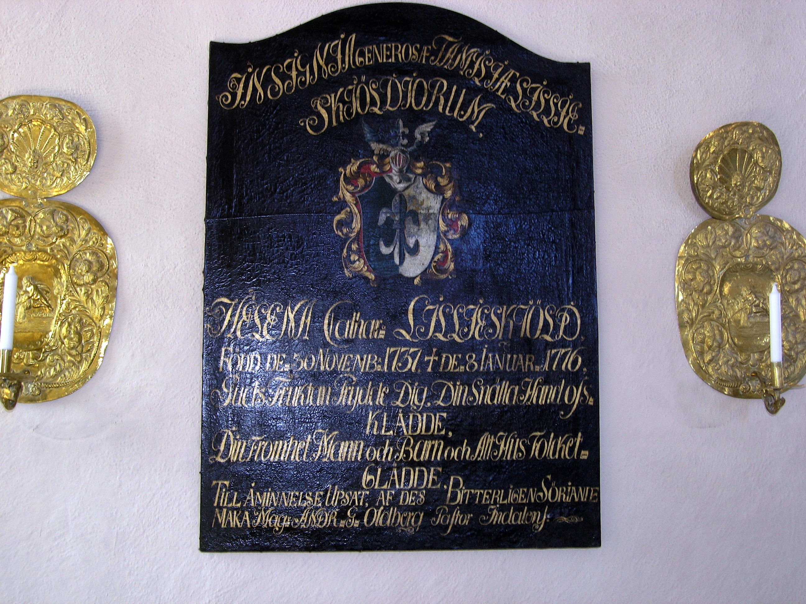 Om du besöker Indals kyrka i Medelpad kan du se denna minnestavla över min mormors morfars farmors mormor. Den berättar att Helena Catharina Lilliesköld föddes den 30 november 1737 och dog den 8 januari 1776.