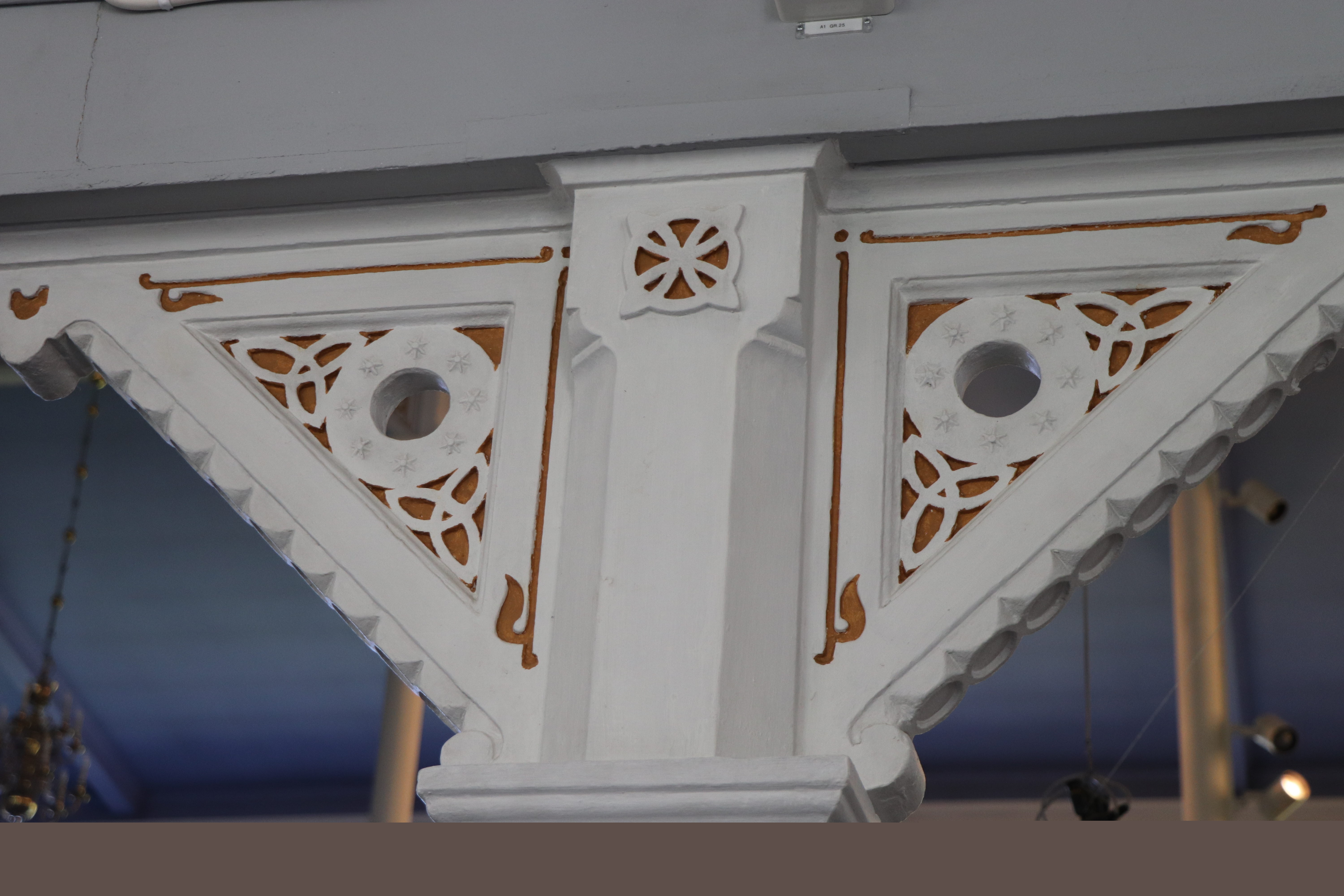 Takkronorna som hänger över läktarbariären är från 1941 och de som hänger under läktarna är från 1970 och är tillverkade av E Johansson Gelbgjuteri, Skara.