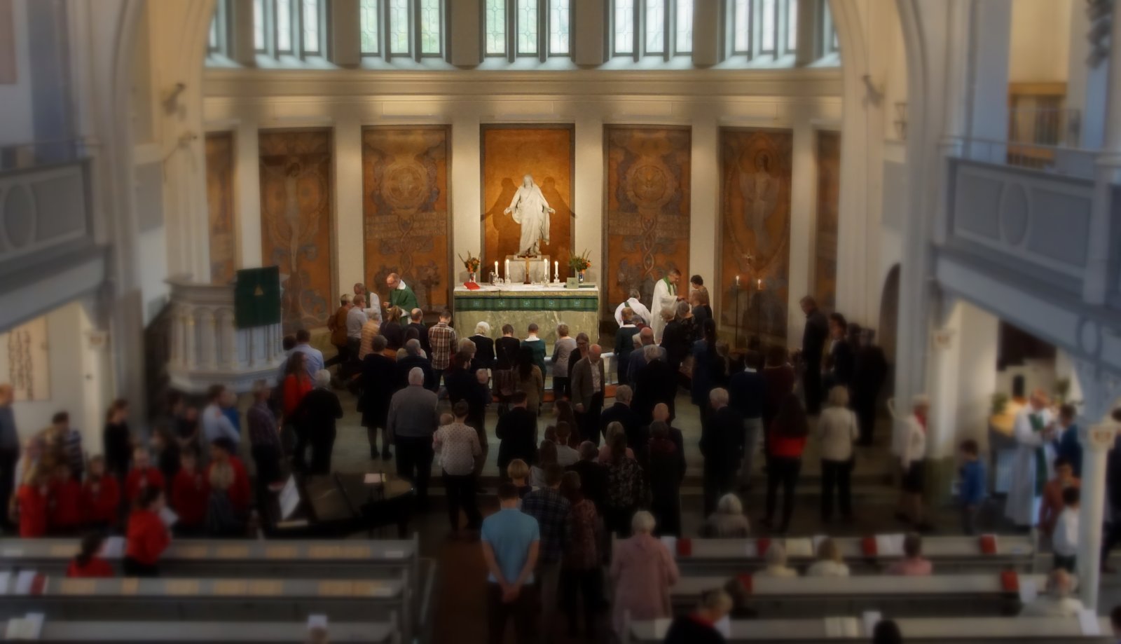 Högmässa varje söndag med söndagsskola som vi också sänder på webben. Varje vardag kl 12.00 är kyrkan också öppen för bön, musik eller mässa.