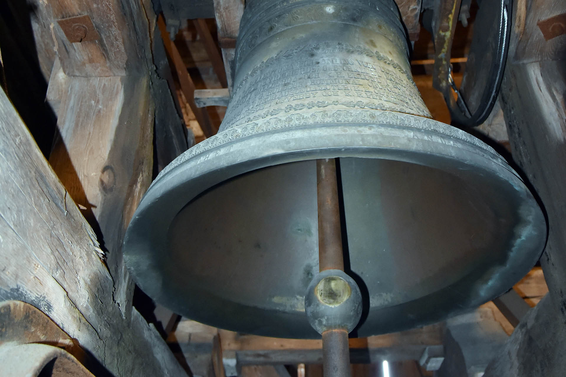Den tidigare medeltida klockans inskription på latin löd i översättning: ”Ära vare Dig, Herre och Maria, nådens och barmhärtighetens moder”.