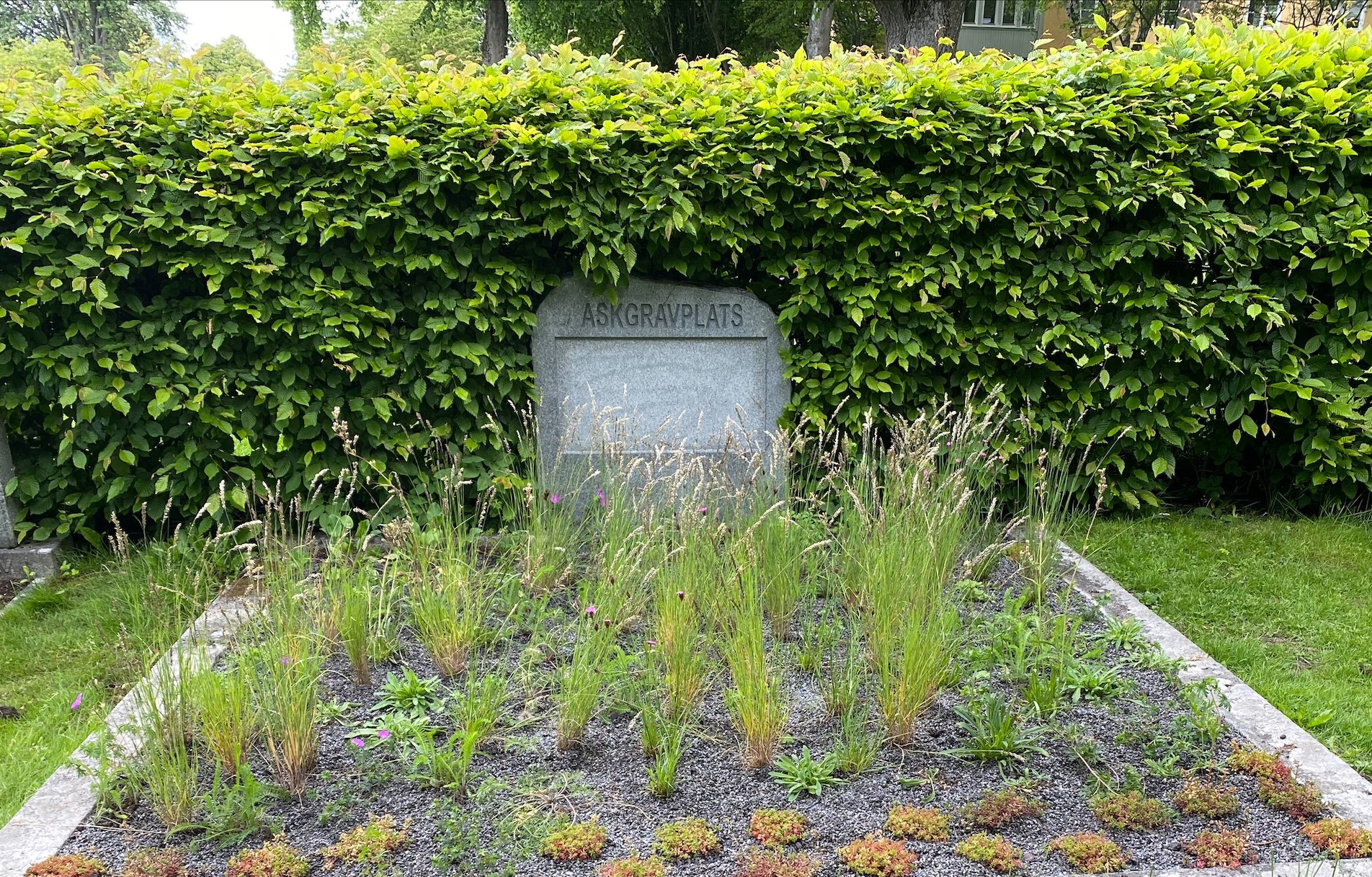Tre av askgravplatserna är omgjorda kistgravplatser där vi använt återlämnade och omslipade gravstenar som huvudsten på vilka namnplattor på de avlidna sätts upp.