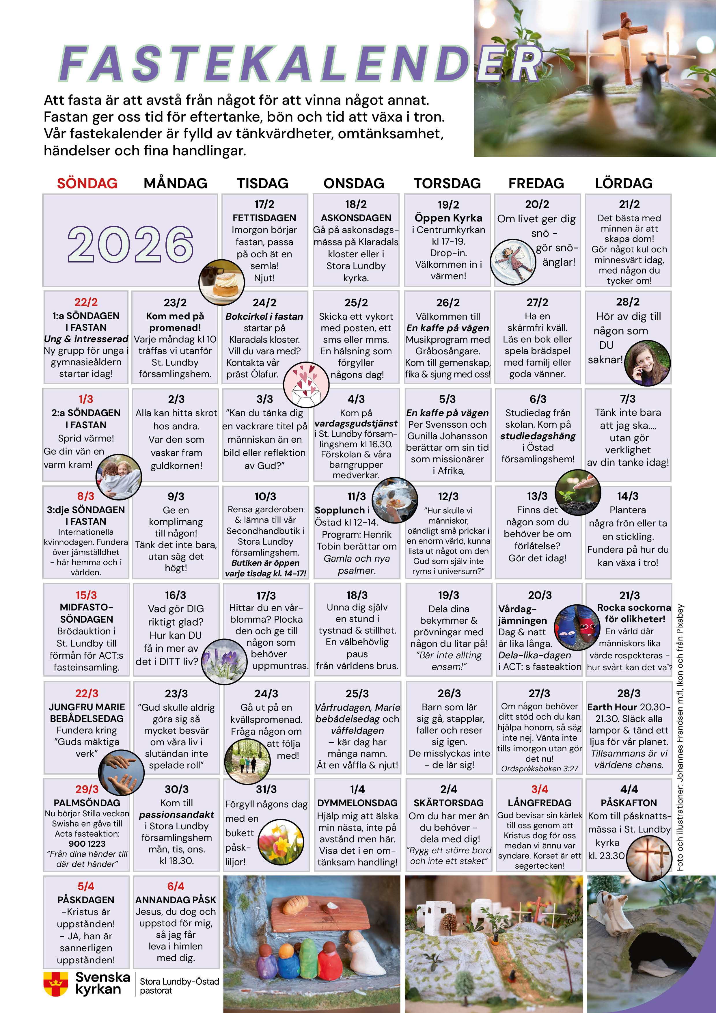 Fastan handlar om att avstå för att göra plats för något nytt, att pröva våra egna liv mot kärleken som Jesus visade när han vandrade lidandets väg mot glädjen, livet och ljuset. Låt fastekalendern inspirera dig!