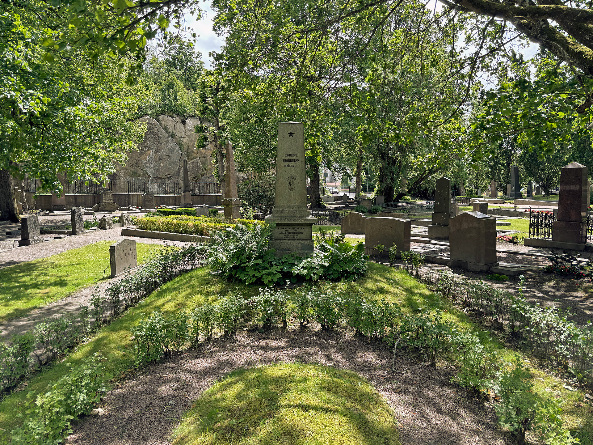 Det finns många medlemmar av den från början skotska familjen Thorburn begravda på Norra begravningsplatsen. I den här graven vilar ett 20-tal infödda eller ingifta medlemmar av denna så betydelsefulla släkt. Här vilar bland annat grosshandlaren och riksdagsmannen Robert Macfie Thorburn, broder till släktens huvudman William Thorburn. Roberts dubbla efternamn härrör ifrån mamman Jessie Macfie. Robert satt i riksdagens andra kammare från 1878 och under stora delar av 1880-talet. Han var även ledamot av stadsfullmäktige, landstingsfullmäktige och delaktig i flera företagsprojekt, bland annat den privata järnvägen Uddevalla-Vänersborg-Herrljunga.