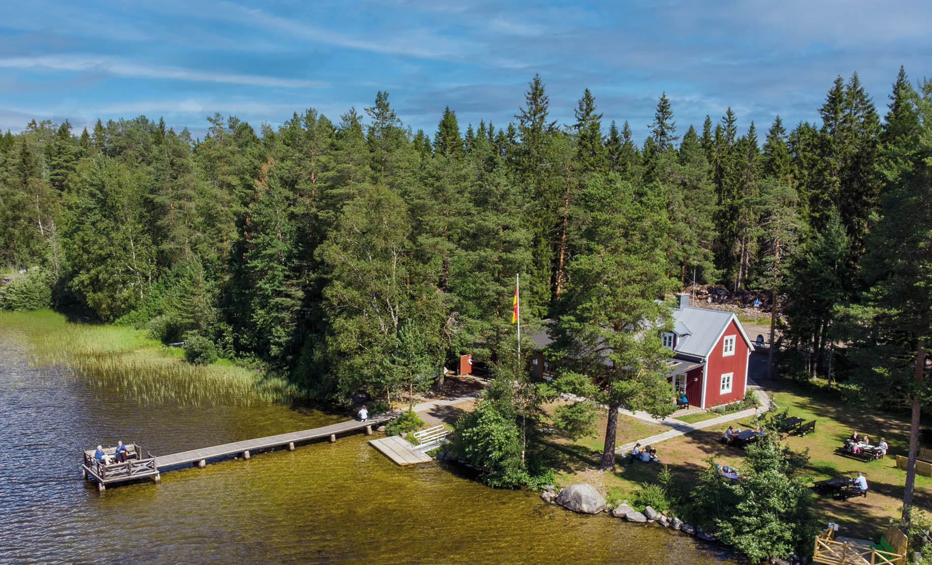 I kaféet finns hembakat fika, glass och rättvisemärkta varor till försäljning, vi tar både Swish och betalkort. Under sommaren firas andakt och mässa varje vecka. Här händer mycket annat också såsom Musik vid sjön, Ungdomskvällar och Öppen förskola, och du kan även koppla av, sola och bada!