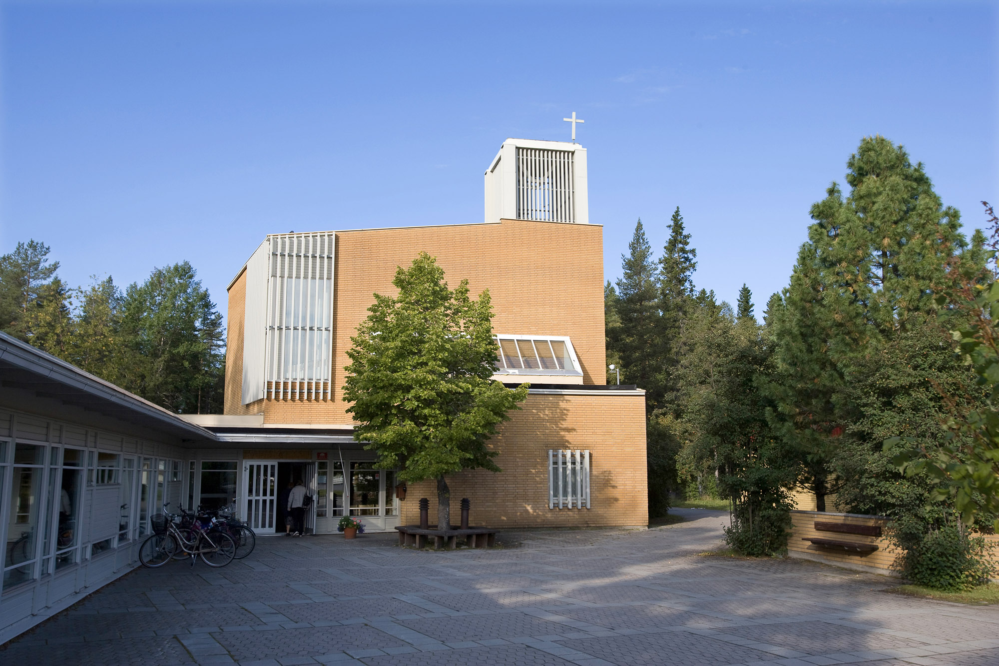 Kyrkan, i gult tegel, invigdes 1982. Den är sammanbyggd med församlingssal och verksamhetslokaler och utgör den öppna mötesplats församlingen strävar efter att vara.