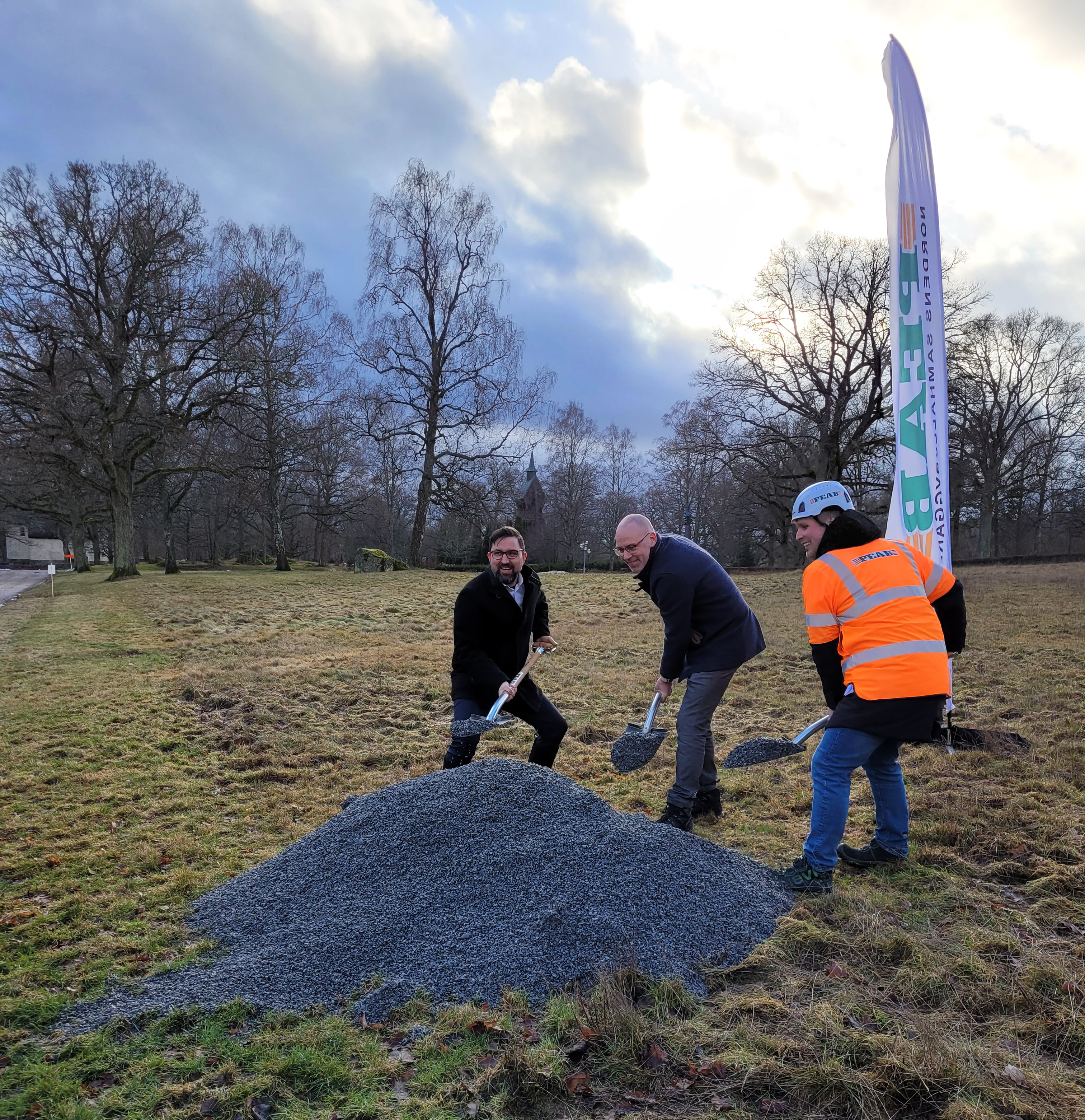 Markarbetena pågår för fullt för att förbereda för själva bygget av det nya krematoriet. Den 5 februari togs symboliska spadtag för att markera att själva bygget närmar sig. Kyrkorådets ordförande Magnus Johansson (till vänster), domprost Daniel Eklund (mitten) och arbetschef Johan Vindelstam (till höger) höll i spadarna.